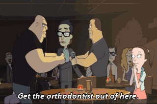 Get the orthodontist out of here. undefined No! Why? Take him out ofthe audience. Kill him. Sic him. Demons... Sack his iife out. i don't give a shit,