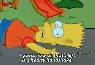 I guess now all that's left is a hearty handshake. Right, guys ? I'm gonna get you again tomorrow, Simpson. Is 3:15 good for you ? Uh, not really. Too bad.