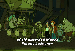 of old discarded Macy's Parade balloons-- Underdog's groin, Bart Simpson's left ear and right shin, Garfield's owner jon's forehead.