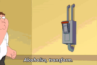 Alcoholics, transform. All right, what the hell's going on in here? We got a noise complaint.