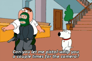 Can you let me pistol-whip you a couple times for the camera? Dang, Stupid robbers with your guns and your make-out parties.