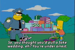 So, you thought you'd pull a fake wedding, eh? You're under arrest. Come on, Chief. It was just a prank. Would some flatware make things right? Um, what does it say on my badge?