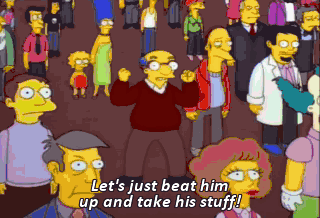 Let's just beat him up and take his stuff! No, no, no! Do not listen to that man. Remain calm. You will all have a chance to be gouged. Thank goodness! Whoa!