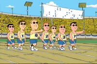 Coming up in this half hour, our undercover expose on conveniently placed news reports in television shows. But first, Peter, look out for that skateboard. Ahh!