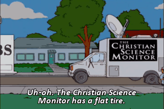 Uh-oh. The Christian Science Monitor has a flat tire. I'll get the spare. No. We must wait for God to jack us.