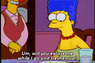 Um, will you excuse me while I go and freshen up? I'll follow her. Just wash your hands and get out.