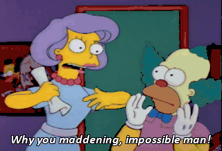 Why you maddening, impossible man! If you don't go tonight I won't be here tomorrow. Oh, all right, I'll go. Oh, Krusty!