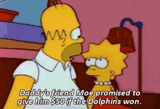 Daddy's friend Moe promised to give him $50 if the Dolphins won. You made a bet? I wouldn't call it a bet. It's a little thing daddies do to make football more exciting.