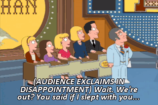 (AUDIENCE EXCLAIMS IN DISAPPOINTMENT) Wait. We're out? You said if I slept with you... All right, Griffins, here's your chance to win the game. Name something you'd like to receive as a gift.
