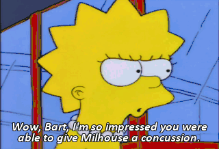 Wow, Bart, I'm so impressed you were able to give Milhouse a concussion. Ah, you're just jealous because... you... stink... at... sports. Cut it out, Bart! What the--