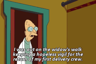 I was out on the widow's walk keeping a hopeless vigil for the return of my first delivery crew.