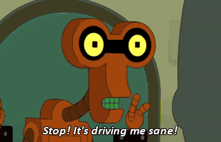 Stop! It's driving me sane! Hey, Bender, you should become an executioner. You could kill humans and wear a cool hood.