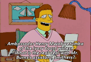 Ambassador Henry Mwabwetumba of the Ivory Coast writes: "What is the real deal with Mr. Burns's assistant, Smithers?