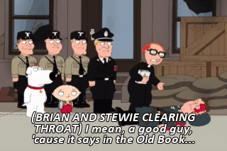 (BRIAN AND STEWIE CLEARING THROAT) I mean, a good guy, 'cause it says in the Old Book... Not so old, though. You know, still good. Still good. Still some things, good things to say...