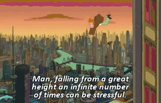 Man, falling from a great height an infinite number of times can be stressful. At least I have Leela's comforting scream to look forward to. Fry. (YAWNS) (SNORING)