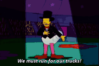 We must run for our trucks! Oh, no, you don't! I paid full price for this freak show! Now, nourish the child within me! Nourish! Un, deux, trois!