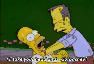 I'll take your head and-- Gorbachev? What-- What are you doing here? I just dropped by with present for warming of house. Instead find you grappling with local oaf.
