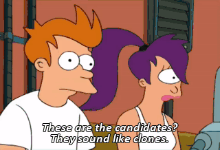 These are the candidates? They sound like clones. Wait a minute. They are clones! Don't let their identical DNA fool you. They differ on some key issues. I say your three-cent titanium tax goes too far.