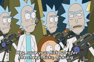 Hey, save your Rick rules for the sheep-Ricks, Rick-pig. - Fuck me, pal. - Fuck you? No, no, no, no, no. Fuck me.