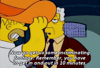 Now go get us some incriminating footage. Remember, you have to get in and out in 10 minutes, or you'll suffer permanent neck damage. He's not kiddin'.
