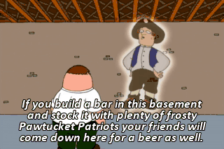 If you build a bar in this basement and stock it with plenty of frosty Pawtucket Patriots your friends will come down here for a beer as well. Build a bar! That's a great idea.