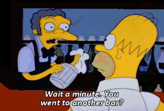 Wait a minute. You went to another bar? Moe, I was 100 miles out of town. Oh, Homer.