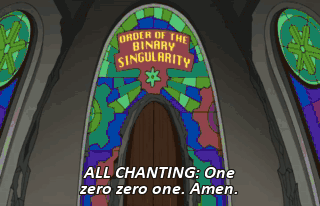 ALL CHANTING: One zero zero one. Amen. Bits to live by. I'm finally at peace.