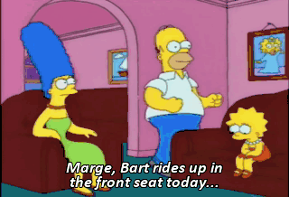 Marge, Bart rides up in the front seat today... because he's a good guy at sports.