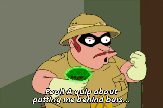 Fool! A quip about putting me behind bars... would've been far more delicious. Here. Catch.
