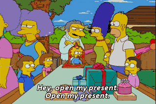 Hey, open my present. Open my present. ts Uncle Moe’s Play Tavern with classic drunk Barney.