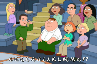 C, D, E, F, G, H, I, J, K, L, M, N, o, P? "P"! Peter! My name's Peter!