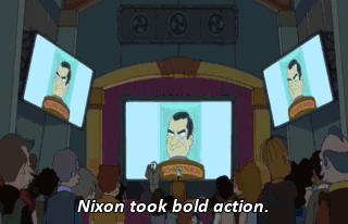 Nixon took bold action. In this time of crisis, I call upon the soylent... I mean, silent majority. (ALL CHEERING) (ALL SCREAMING) Still good. TRAVERS: With the working class gone,