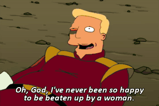 Oh, God, I've never been so happy to be beaten up by a woman. Let's do it again sometime.