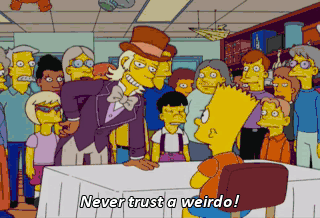 Never trust a weirdo! Azoot! I'm stuck on a nail! (CHUCKLING) Oh, God, that's painful.