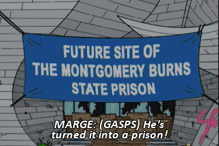 MARGE: (GASPS) He's turned it into a prison! (GROANS) (ALL HOOTING) (CLANKING)