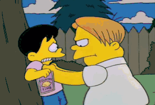 There's never been anything close to a lemon in it. I swear! Hey, nobody hassles my little brother! Hey, no one manhandles the bosom chum of Nelson Muntz! Spring forth, burly protector, and save me!