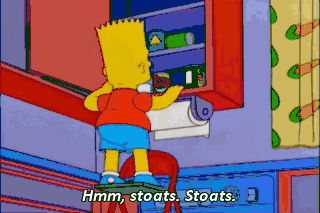 Hmm, stoats. Stoats. Stoats are weasels, Bart. They don't come in cans. Then what's this? That says "corn," Bart. Must you embarrass me?
