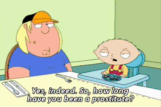 Yes, indeed. So, how long have you been a prostitute? No, Doug, I will not lift up her shirt. Chris, we have company. So, you ever been with a woman? No. Peter! What? There. Are you happy, Doug?