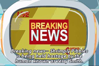 Breaking news-- Shrimply Pibbles is being held hostage by the human known as Jerry Smith.