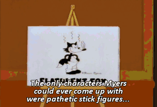 The only characters Myers could ever come up with were pathetic stick figures... with the words "Sarcastic Horse" and "Manic Mailman" printed on 'em.