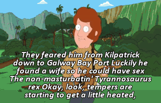 They feared him from Kilpatrick down to Galway Bay Port Luckily he found a wife so he could have sex The non-masturbatin' Tyrannosaurus rex Okay, look, tempers are starting to get a little heated,