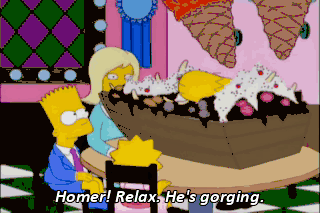 Homer! Relax. He's gorging. Okay, maybe not. We gotta save him!