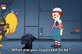 What are you supposed to be? Raggedy Andy. Get the fuck out of my bounty hunter meeting.