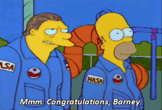 Mmm. Congratulations, Barney. That's very gracious of you, Homer. Please join us in a toast. To the mission!