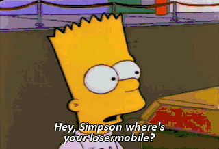 Hey, Simpson where's your losermobile? Losermobile. Wait a minute. Uh, it's over there, Nelson. Whoa, talk about your pieces of crap.
