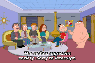 The cedars represent society. Sorry to interrupt. Listen, you got to get out of here. If James Woods sees you, he's gonna call the cops. I miss my family, Brian, and I gotta see them.