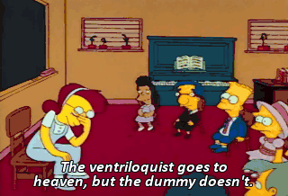 The ventriloquist goes to heaven, but the dummy doesn't. - Oh, oh, oh ! Me ! - Bart ? What about a robot with a human brain ? I don't know ! All these questions ! Is a little blind faith too much to ask ?