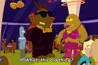 What, this old thing? I murdered my father. My name's Lrrr, ruler of the planet Omicron Persei 8. I am called Grrl. Of the planet Omicron Persei 8? That is a pretty name!