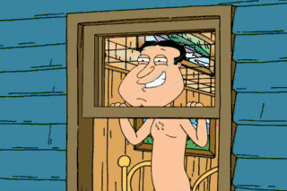 Ow! UGh! ugh! Hello, 911? It's Quagmire. Yeah. Yeah, Yeah, It's in a window this time. Wow, look at them run. Wait a second, Brian.