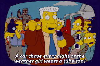 A car chase every night or the weather girl wears a tube top! And if she doesn't, you win a pizza!